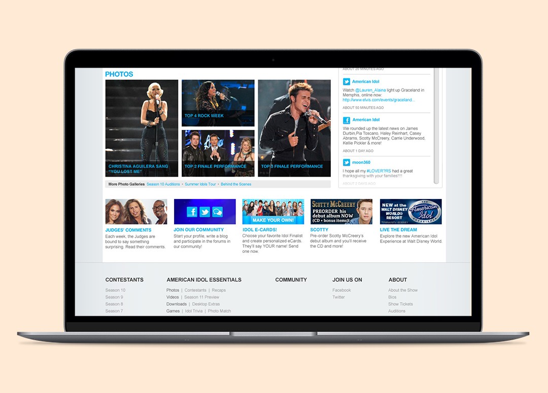The American Idol homepage had to move as fast as the show, surfacing live schedules, auditions, contestant profiles, video recaps, and breaking news in real time. That meant building flexible modules that could adapt to constant content changes without losing clarity.