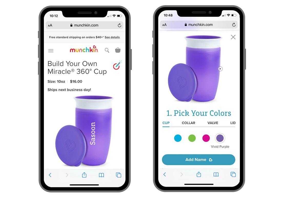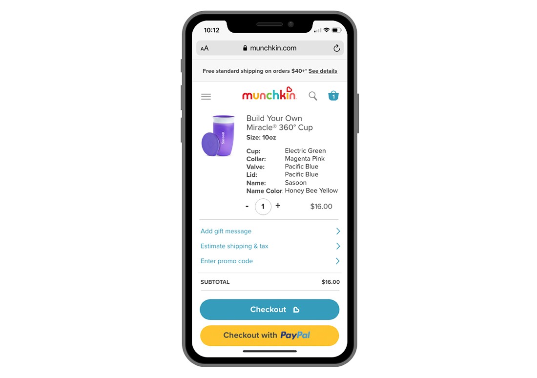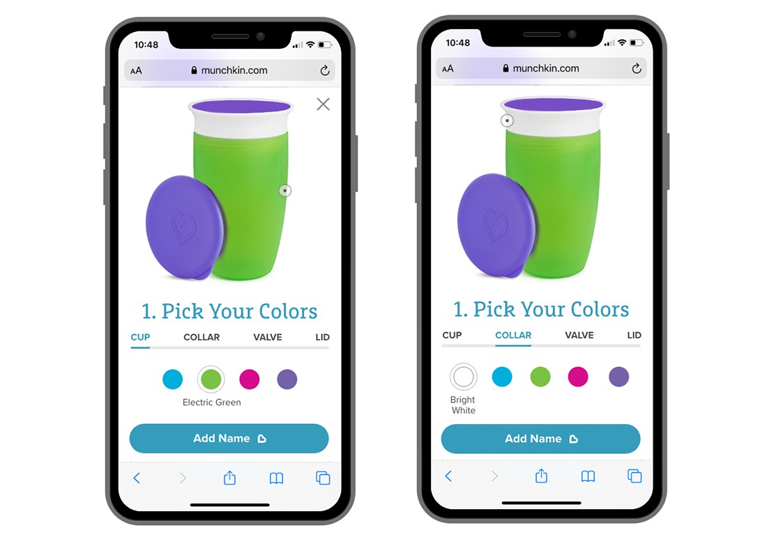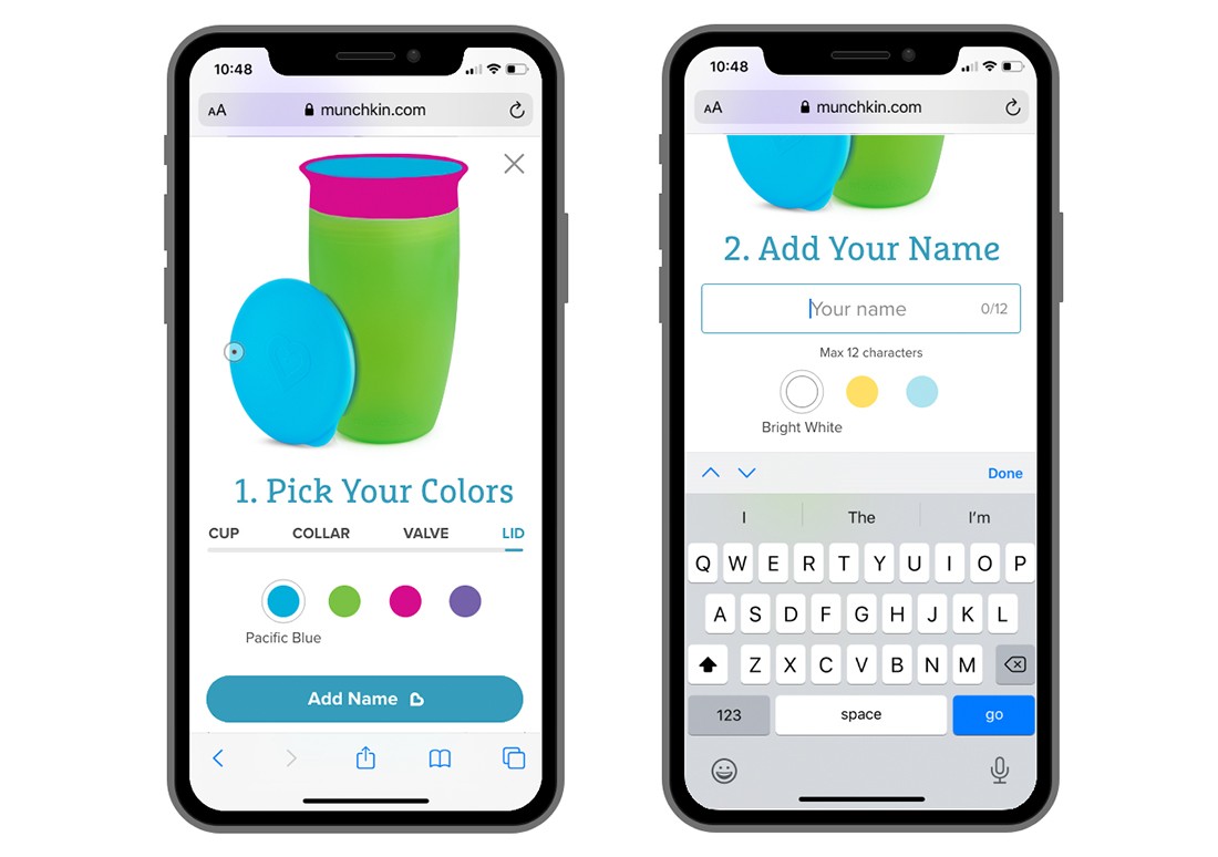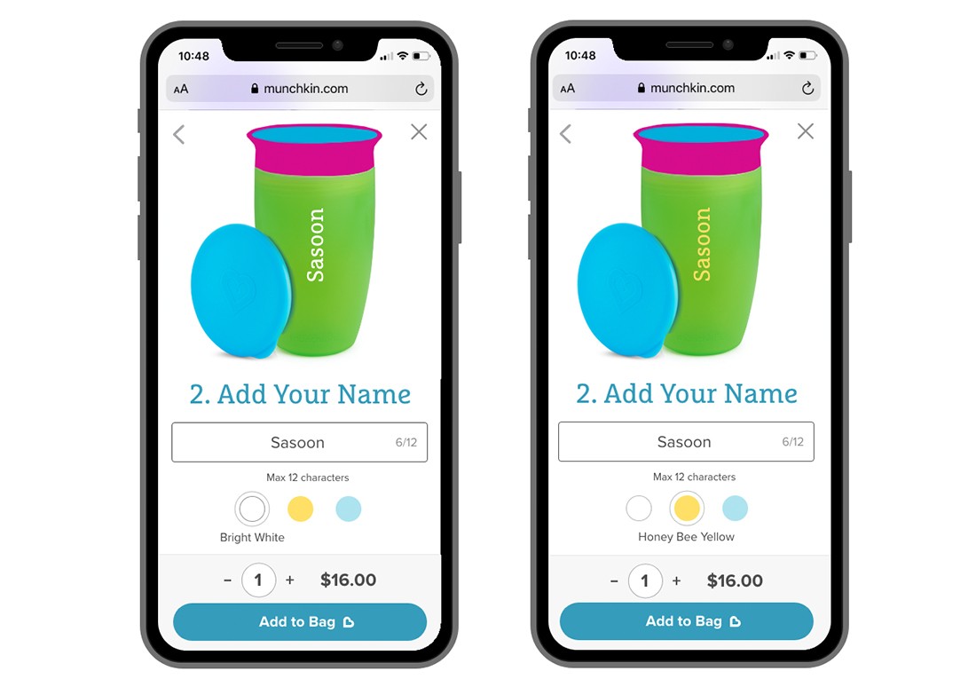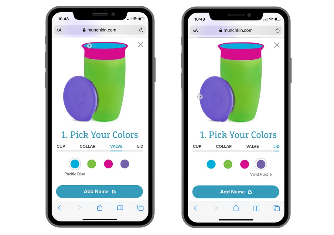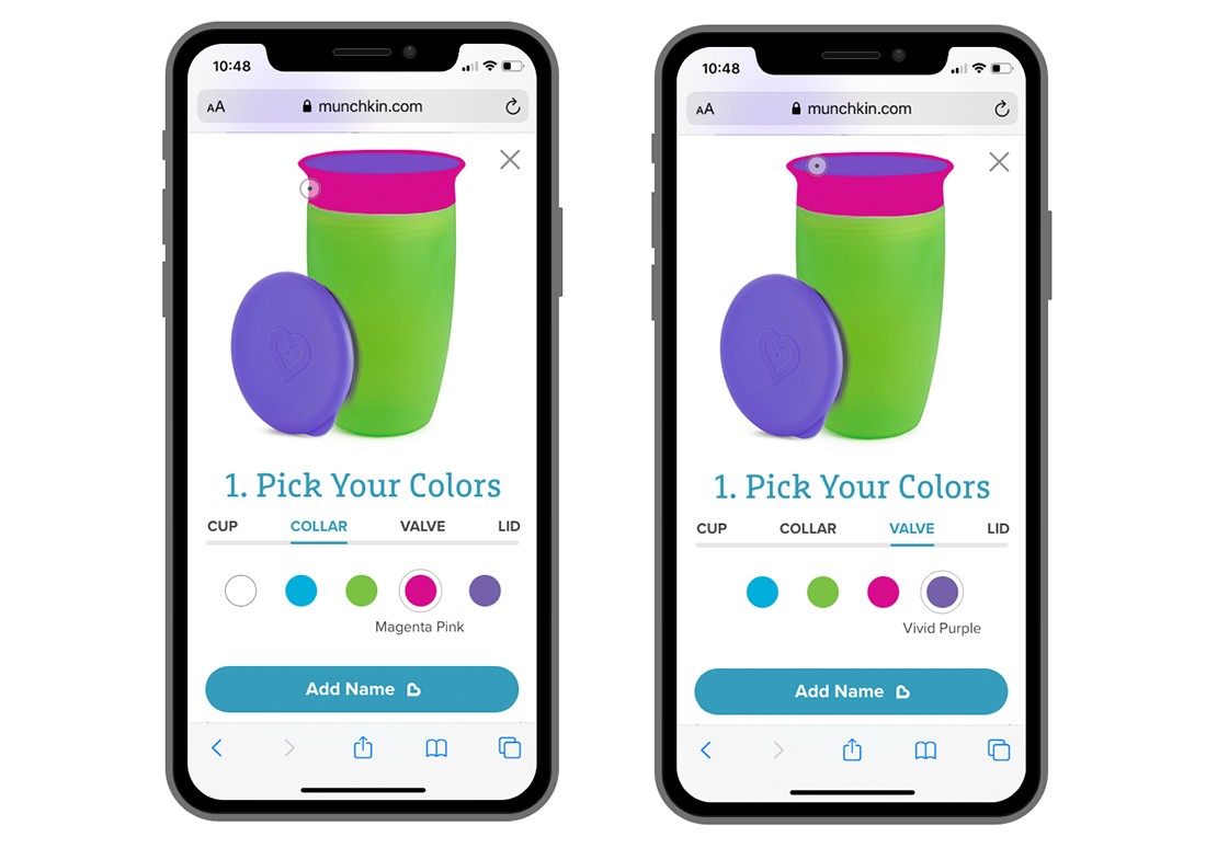 Designed the Build Your Own Cup Product experience for Munchkin's beloved Miracle® 360° Sippy Cup. Designed for mobile first. In 2 easy steps, you can: 1. Pick Your Colors for your cup body, collar, valve, lid & 2. Add Your Name. Set style guide product requirements for font colors and sizes for your name. Created unique color swatch names.
