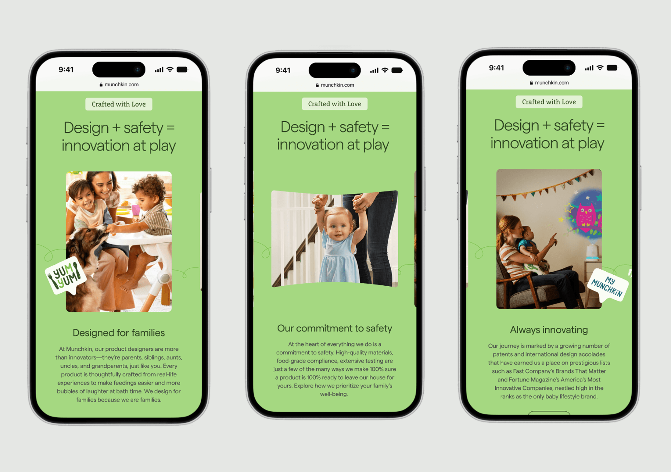 Designed a Shop & Explore module with curated collections by age and need, a product grid surfacing Bestsellers, New Arrivals, and Exclusives, and integrated media cards promoting Munchkin's parenting podcast — blending shopping with content to keep parents engaged.
